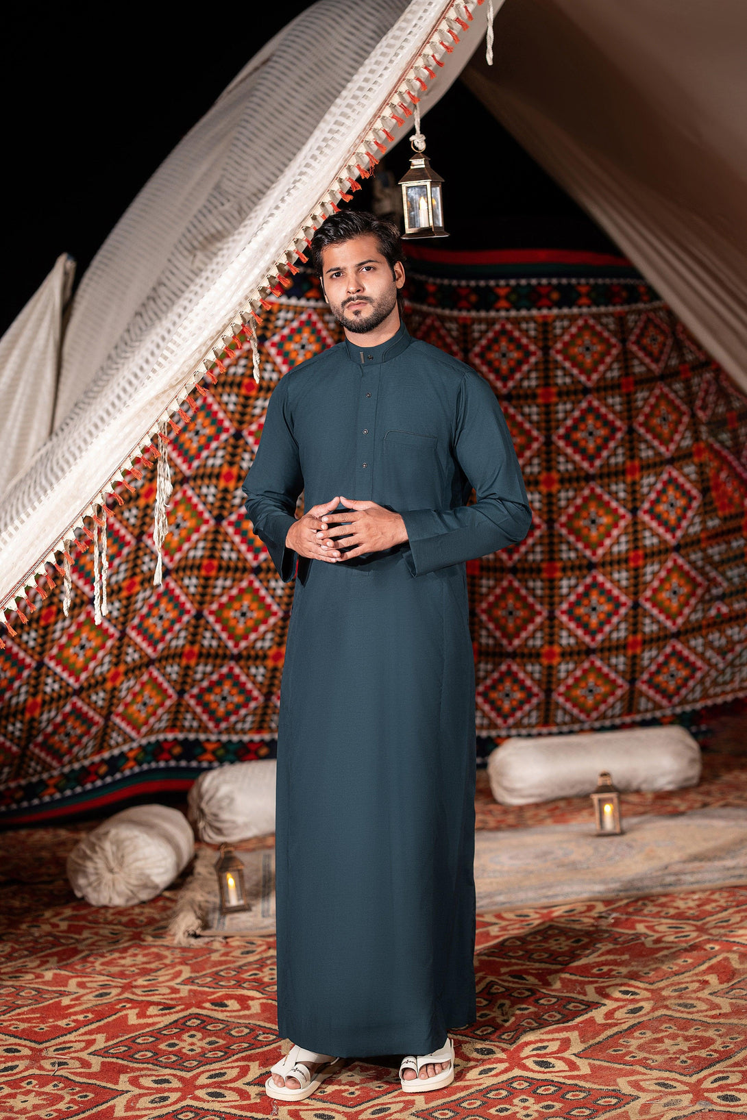 ثوب سعودي أخضر زمردي داكن بياقة دائرية وحواف