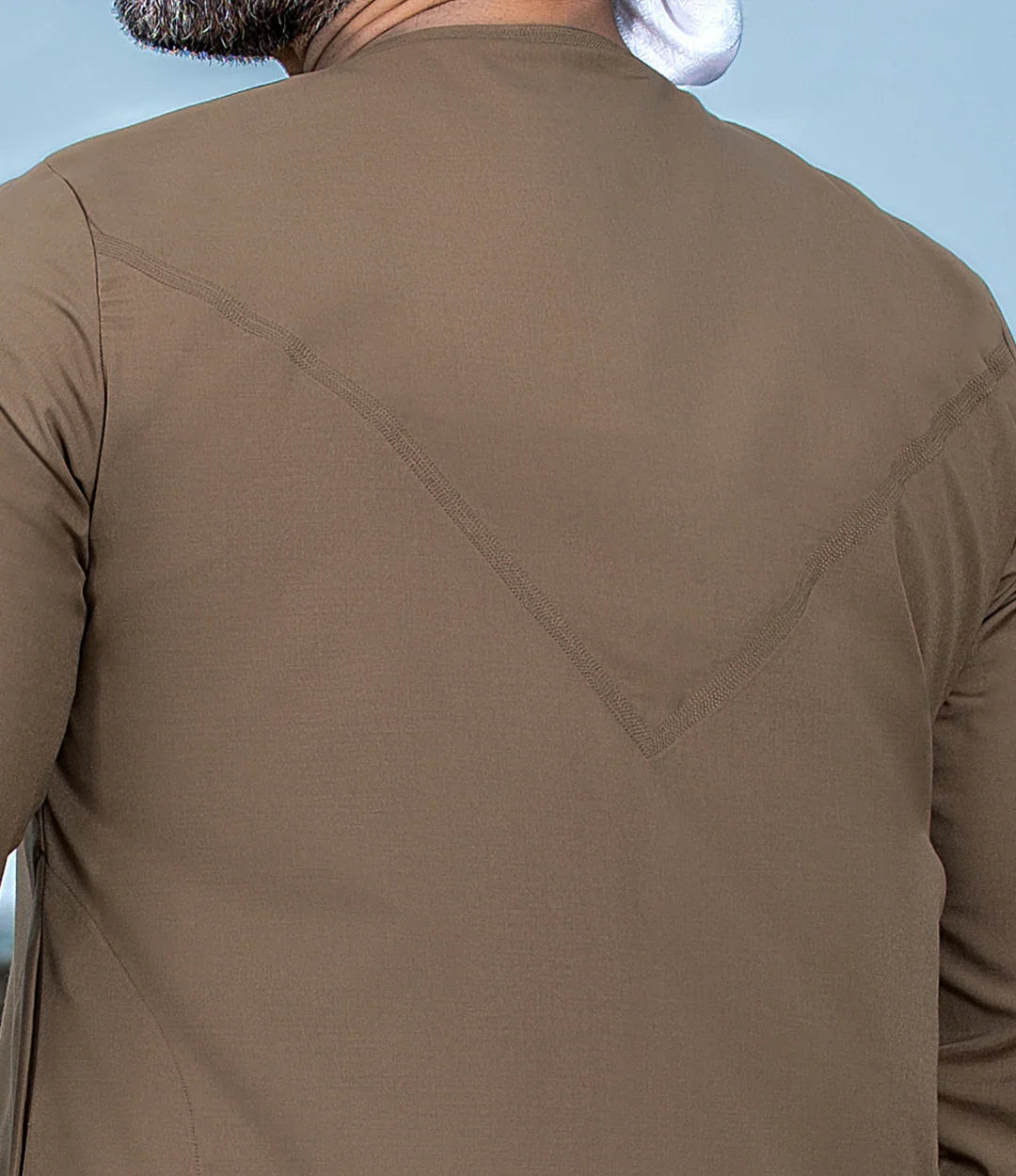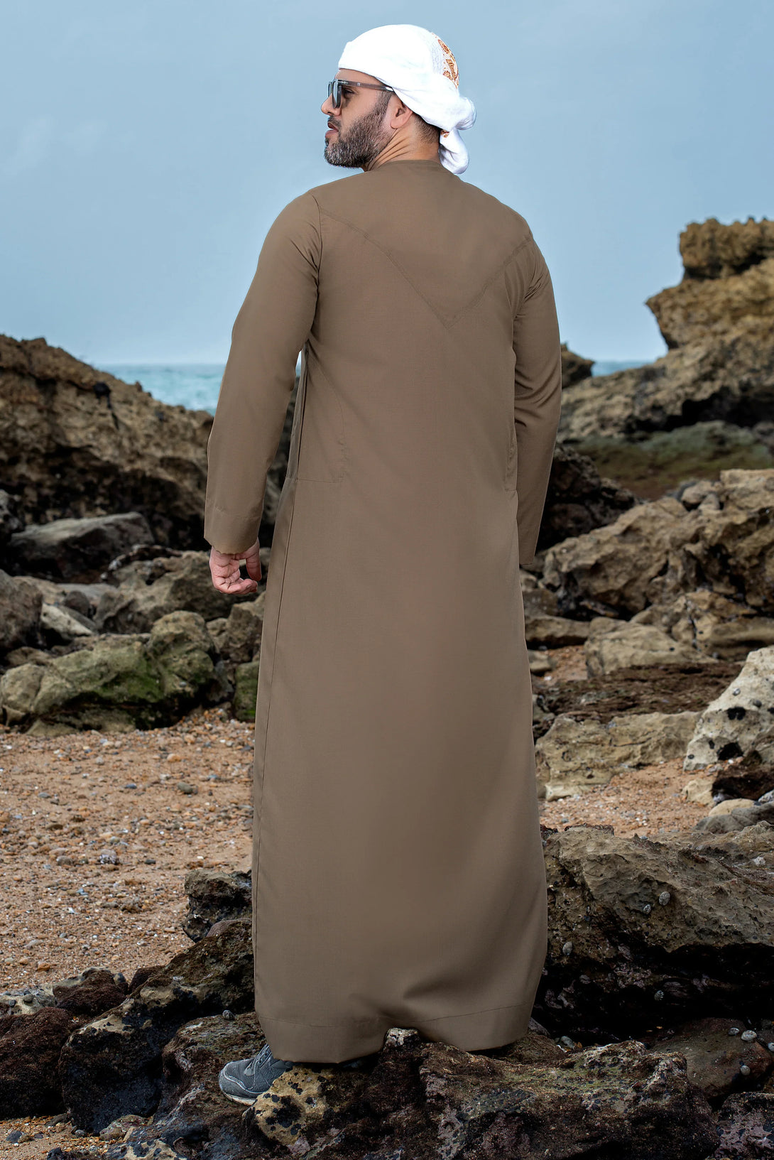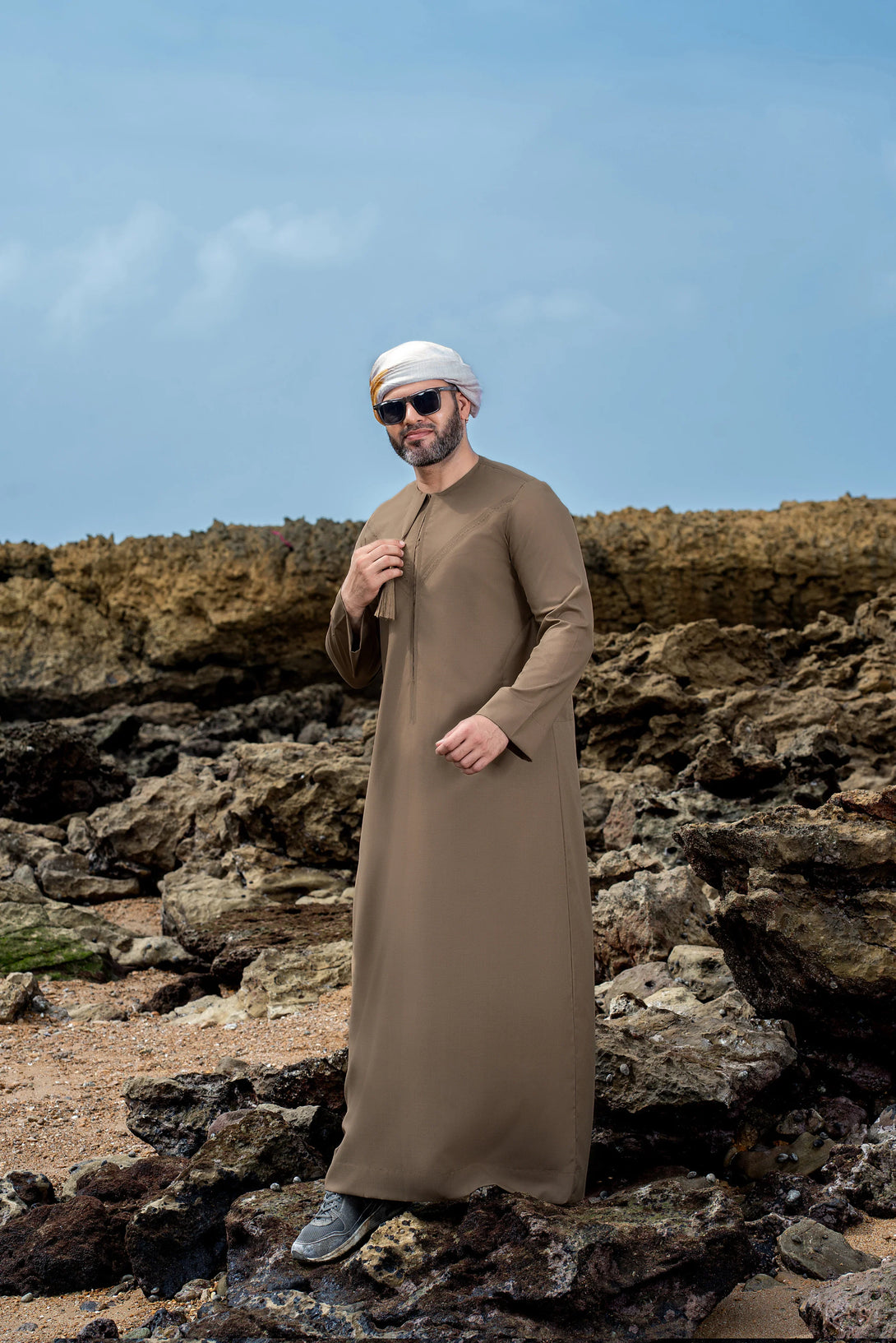 استمتعي بلمسة راقية من الأناقة مع كندورتنا العمانية بلون القهوة. مصنوعة من قماش بوسكي تايلاندي فاخر قابل للغسل والارتداء. تتميز بتصميم عماني كلاسيكي مميز، وخياطة متقنة. إنها تعبير خالد عن الأناقة والرقي.