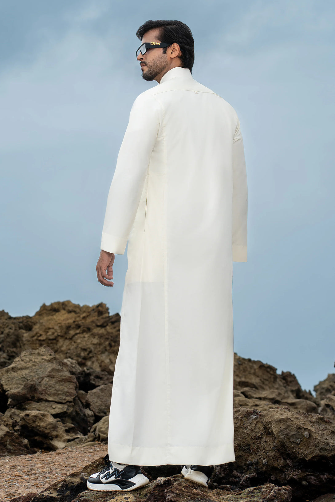 ثوب سعودي كريمي بياقة دائرية مع حواف