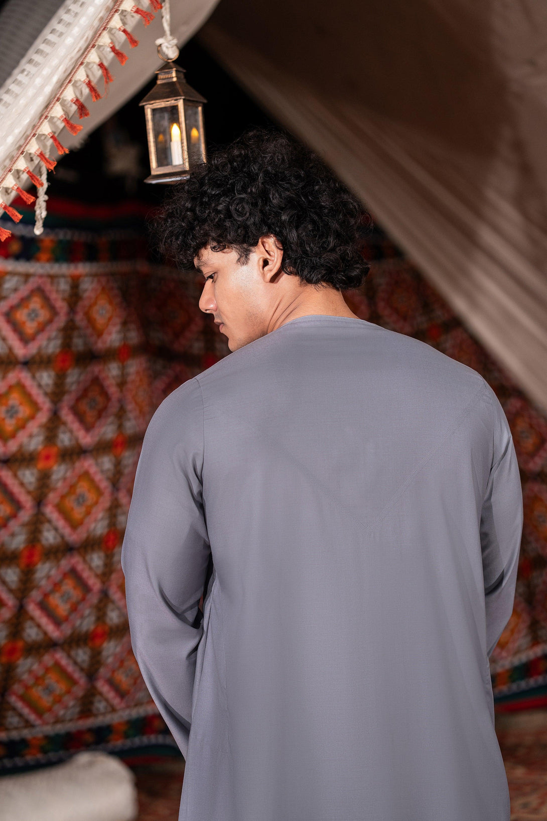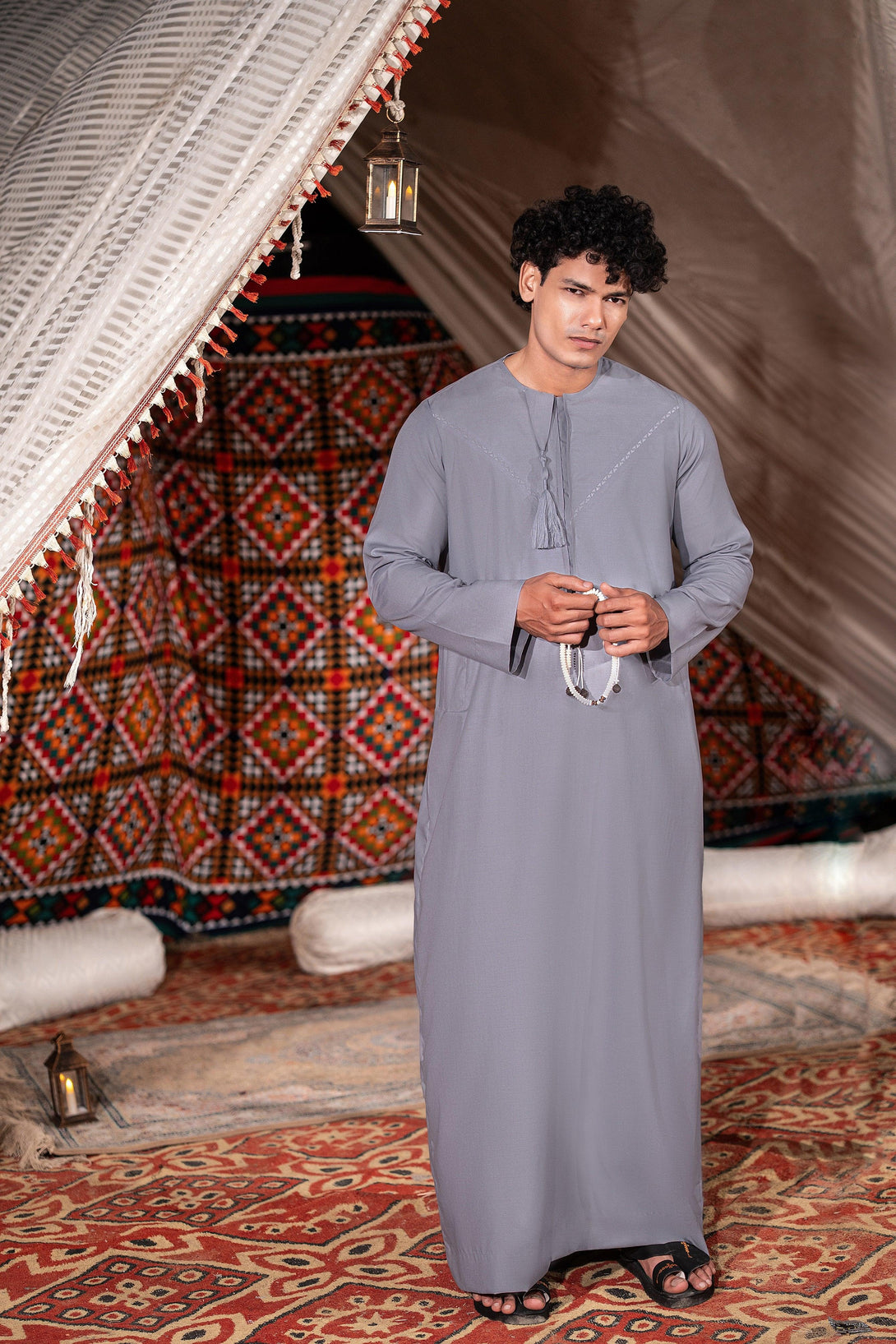استمتعي بلمسة راقية من الأناقة مع الكندورة العمانية الرمادية الفضية. مصنوعة من قماش بوسكي فاخر قابل للغسل والارتداء. تتميز بياقة كلاسيكية أنيقة، وتصميم عماني مميز، وخياطة متقنة. إنها تعبير خالد عن الأناقة والرقي.