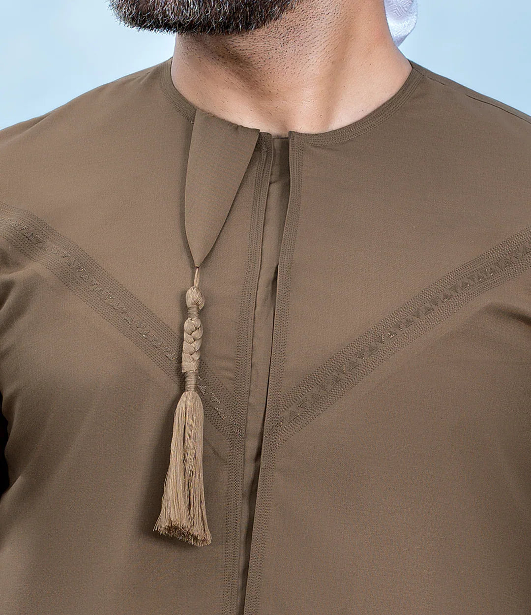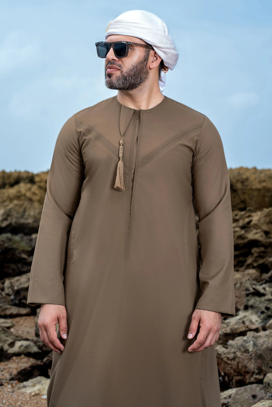 استمتعي بلمسة راقية من الأناقة مع كندورتنا العمانية بلون القهوة. مصنوعة من قماش بوسكي تايلاندي فاخر قابل للغسل والارتداء. تتميز بتصميم عماني كلاسيكي مميز، وخياطة متقنة. إنها تعبير خالد عن الأناقة والرقي.