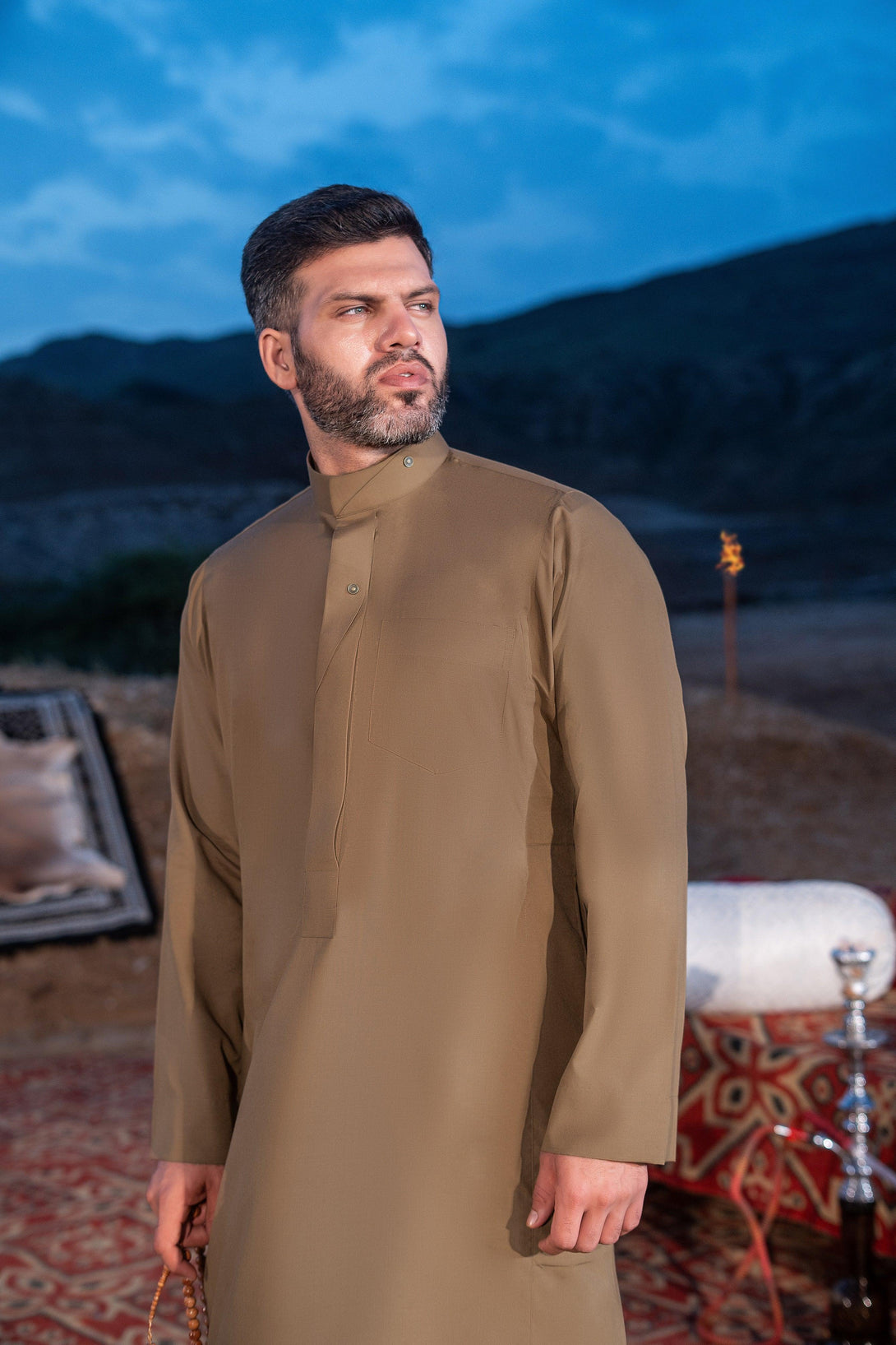 تمتع بأناقة راقية مع ثوبنا السعودي بلون القهوة بياقة قميص. مصنوع من قماش بوسكي الفاخر سهل الغسل والارتداء. يتميز بياقة أنيقة وأكمام مطوية وخياطة متقنة. إنه رمز خالد للأناقة والرقي.