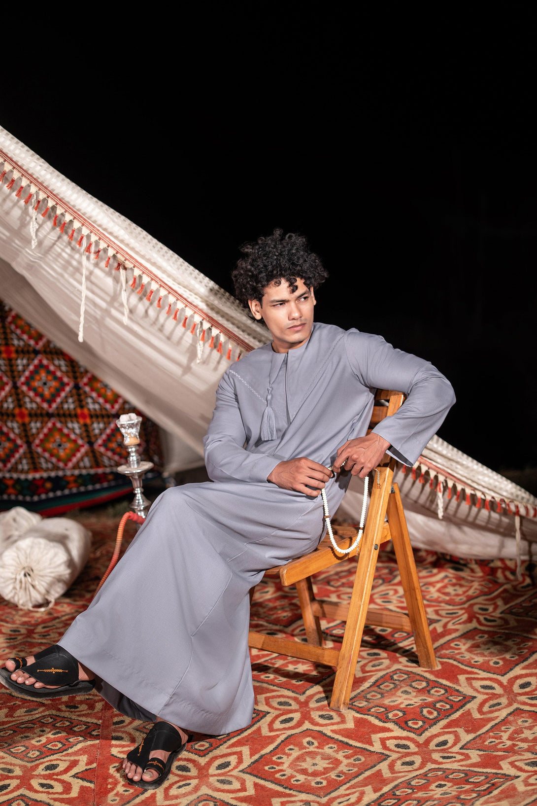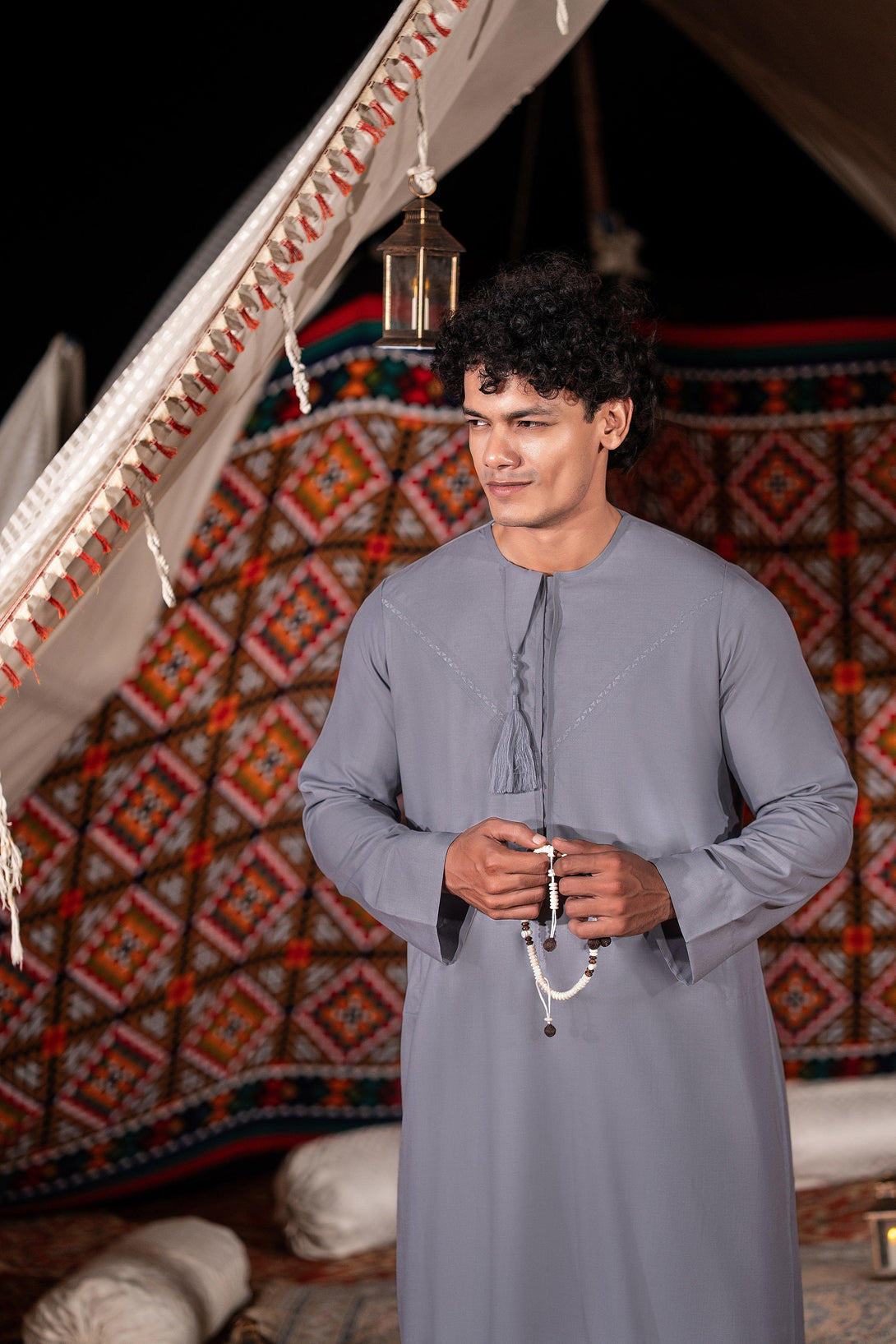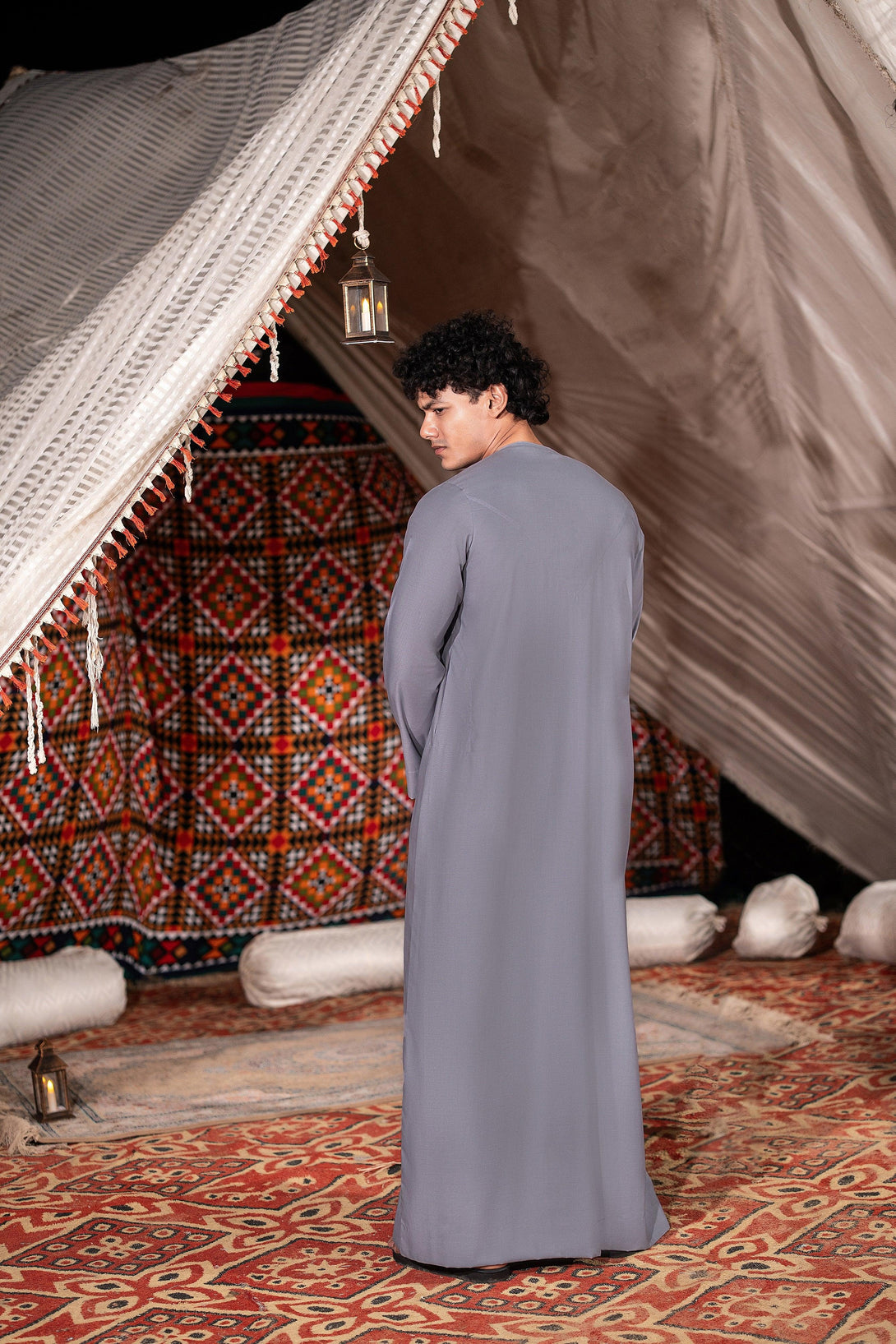 استمتعي بلمسة راقية من الأناقة مع الكندورة العمانية الرمادية الفضية. مصنوعة من قماش بوسكي فاخر قابل للغسل والارتداء. تتميز بياقة كلاسيكية أنيقة، وتصميم عماني مميز، وخياطة متقنة. إنها تعبير خالد عن الأناقة والرقي.