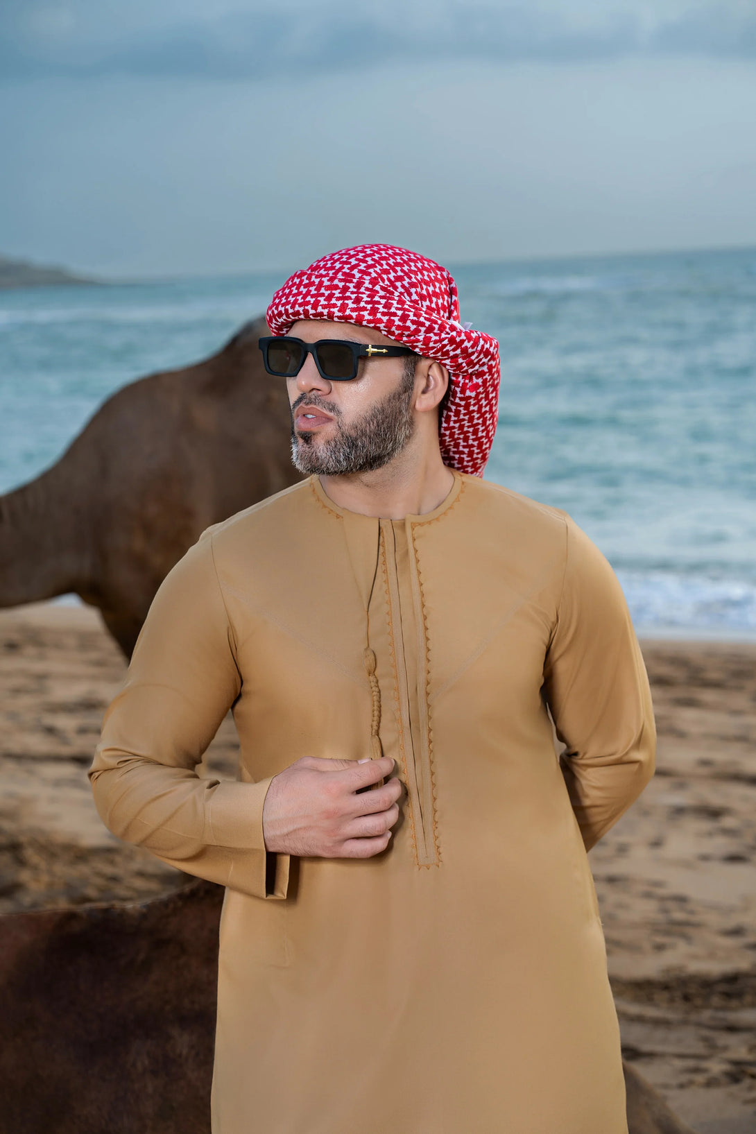 Experience refined sophistication with our Camel Fawn Omani Kandura. Crafted from Premium Wash & Wear Ammonia Finish fabric. It features a classic signature Omani design, and impeccable stitching. A timeless expression of elegance and class.