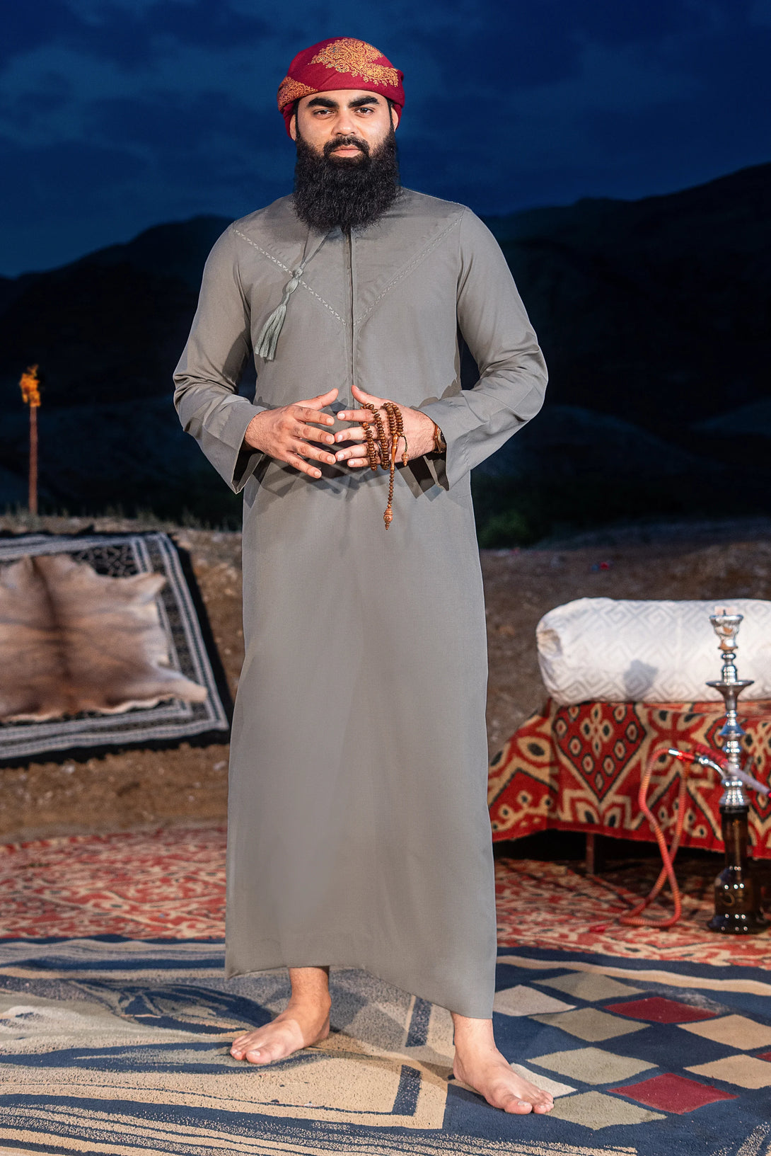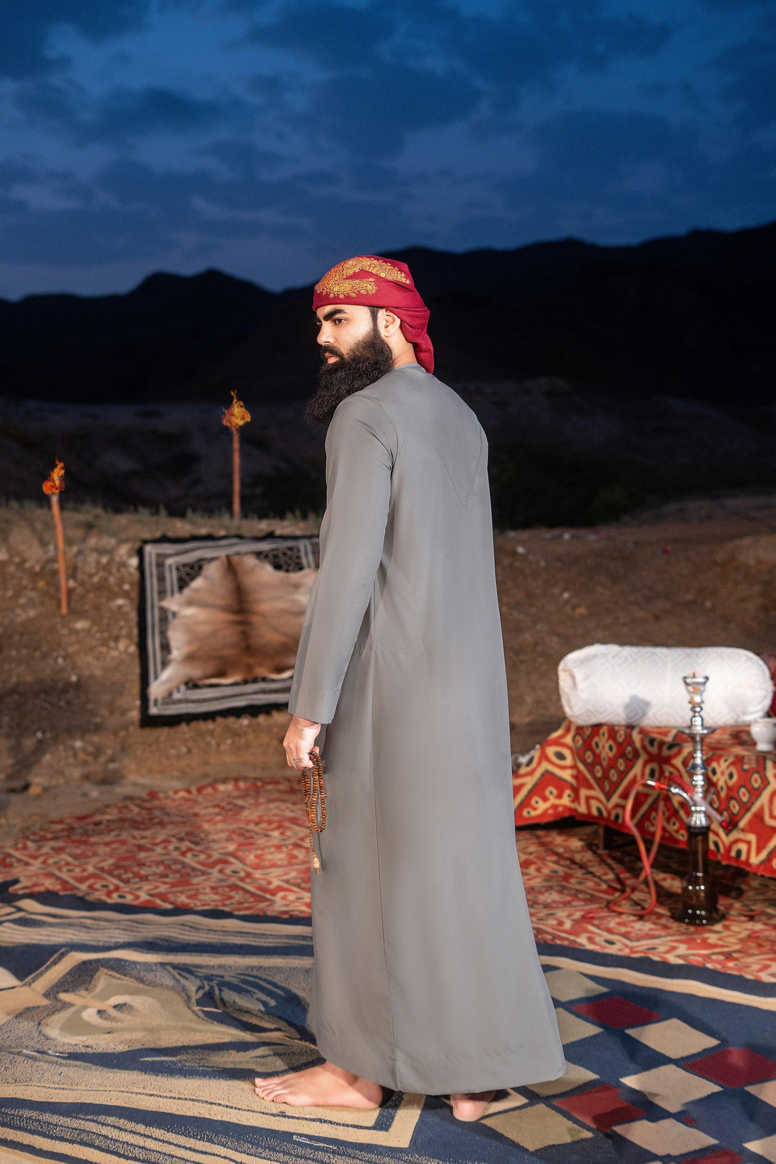 Experience refined sophistication with our Gray Omani Kandura. Crafted from Premium Wash & Wear Thai Boski Finish fabric. It features a classic signature Omani design, and impeccable stitching. A timeless expression of elegance and class.